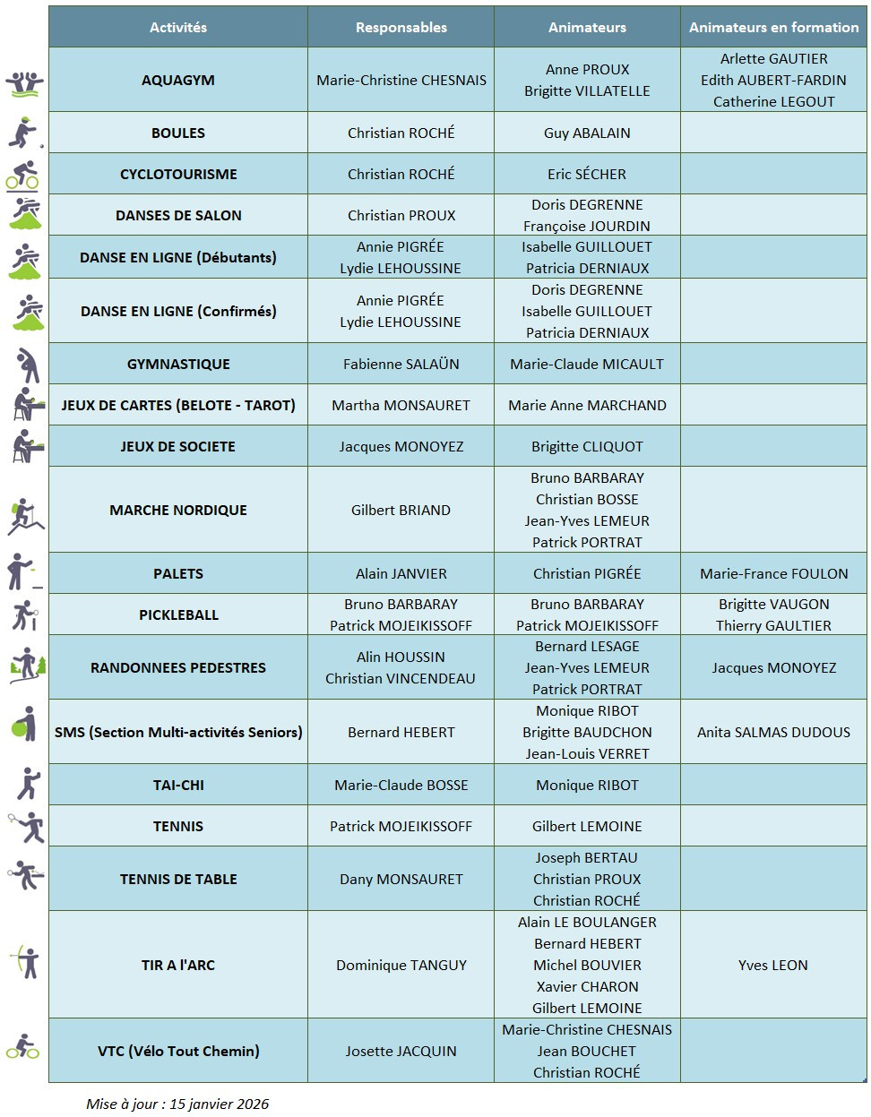 Cette liste des activités pratiquées à la Retraite Sportive Bainaise est mise à jour régulièrement. Elle indique pour chacune des activité les animateurs, les responsables d'activités, ainsi que les animateurs en cours de formation.